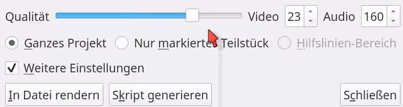 Bei mir hat das Anhaken von „mit Max. rendern“ und so Sachen nichts gebracht. Die Audioqualität fällt meist nichts ins Gewicht, von der Dateigröße und so. Wenn du aber nur Sprache hast wirst auch da kein unterschied merken zwischen 160 und 320 kb/s. Es ist ja nicht nur die Größe, sondern, wenn du mit langsamerer Hardware aufnimmst, entlastet das vielleicht den Prozessor. Also auch die Aufnahmen kannst so optimieren, und es entsprechend mit geringeren Einstellungen aufnehmen.